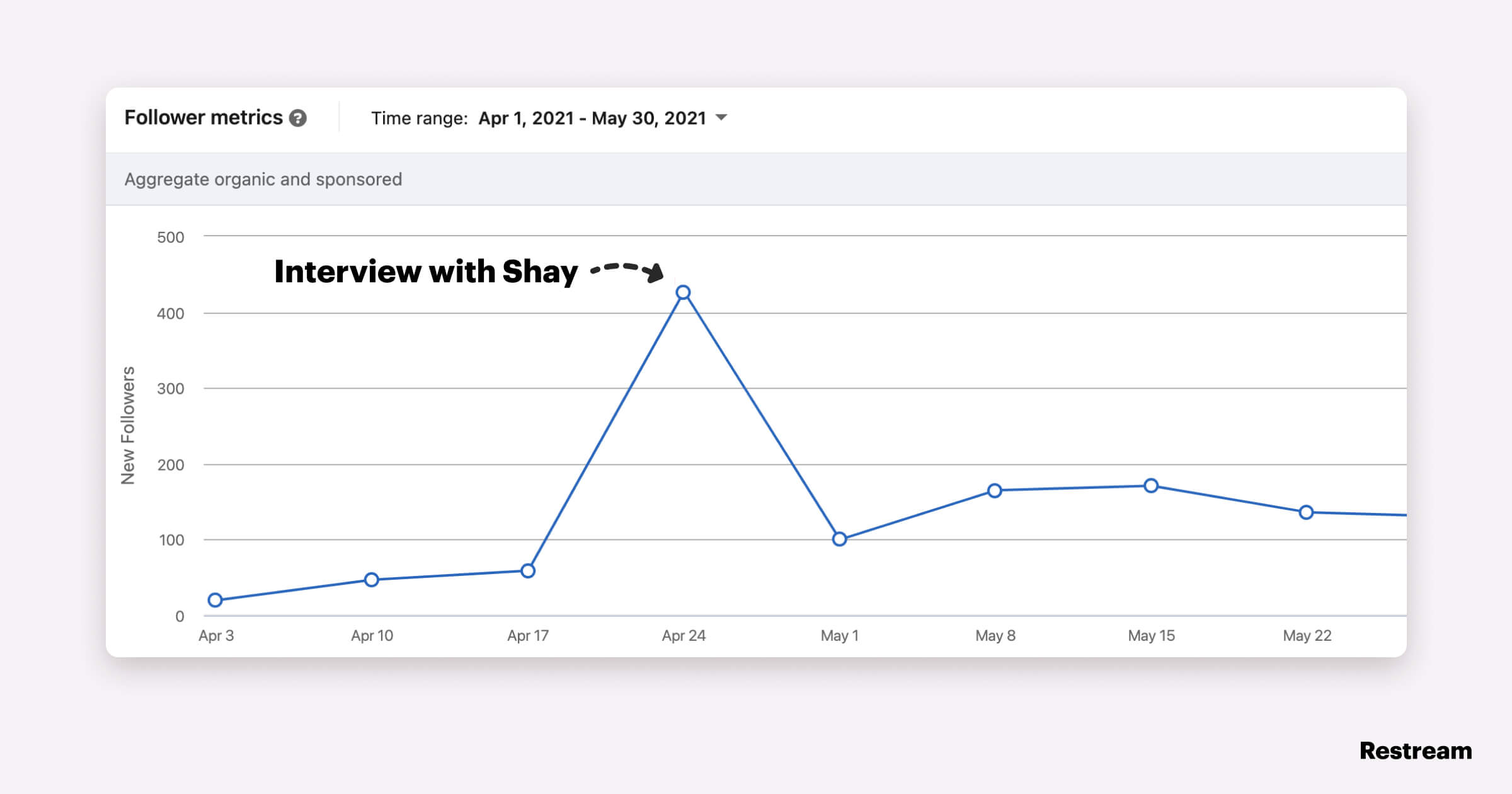 And it’s not just about doubling your views. Streaming your interview on your guests' channels can instantly expand your fanbase. See how the Restream LinkedIn page following went up after an interview with Shay Rowbottom.👇
