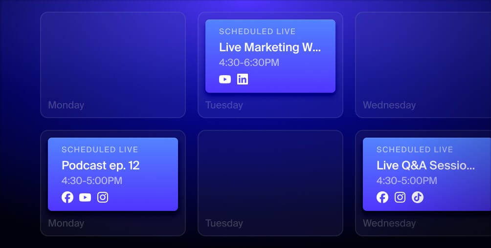 Schedule recorded videos to appear live when you are away. Perfect for glitch-free streaming, repurposing, or simply taking a break.