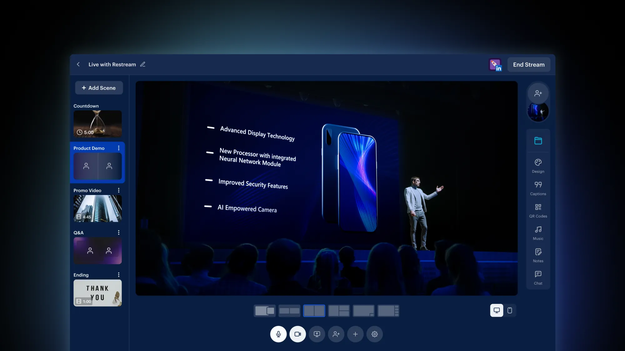 - Multistreaming capability: Broadcast to LinkedIn alongside platforms like YouTube, Facebook, and Instagram to maximize your reach.