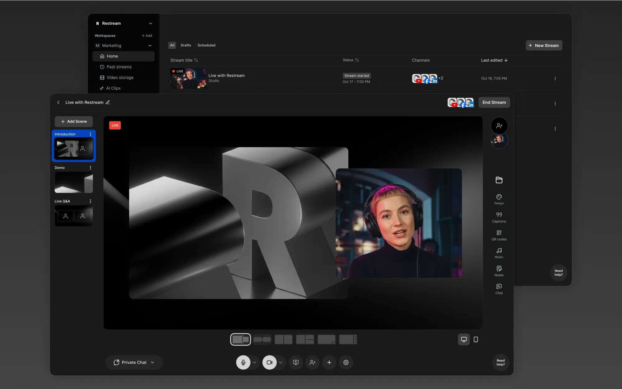 Enjoy a sleek, modern look that lets your content shine. With a refined monochrome palette and subtle, distraction-free controls, you can focus entirely on creating. Stream, produce, and collaborate in a space that’s effortlessly stylish and easy on the eyes.