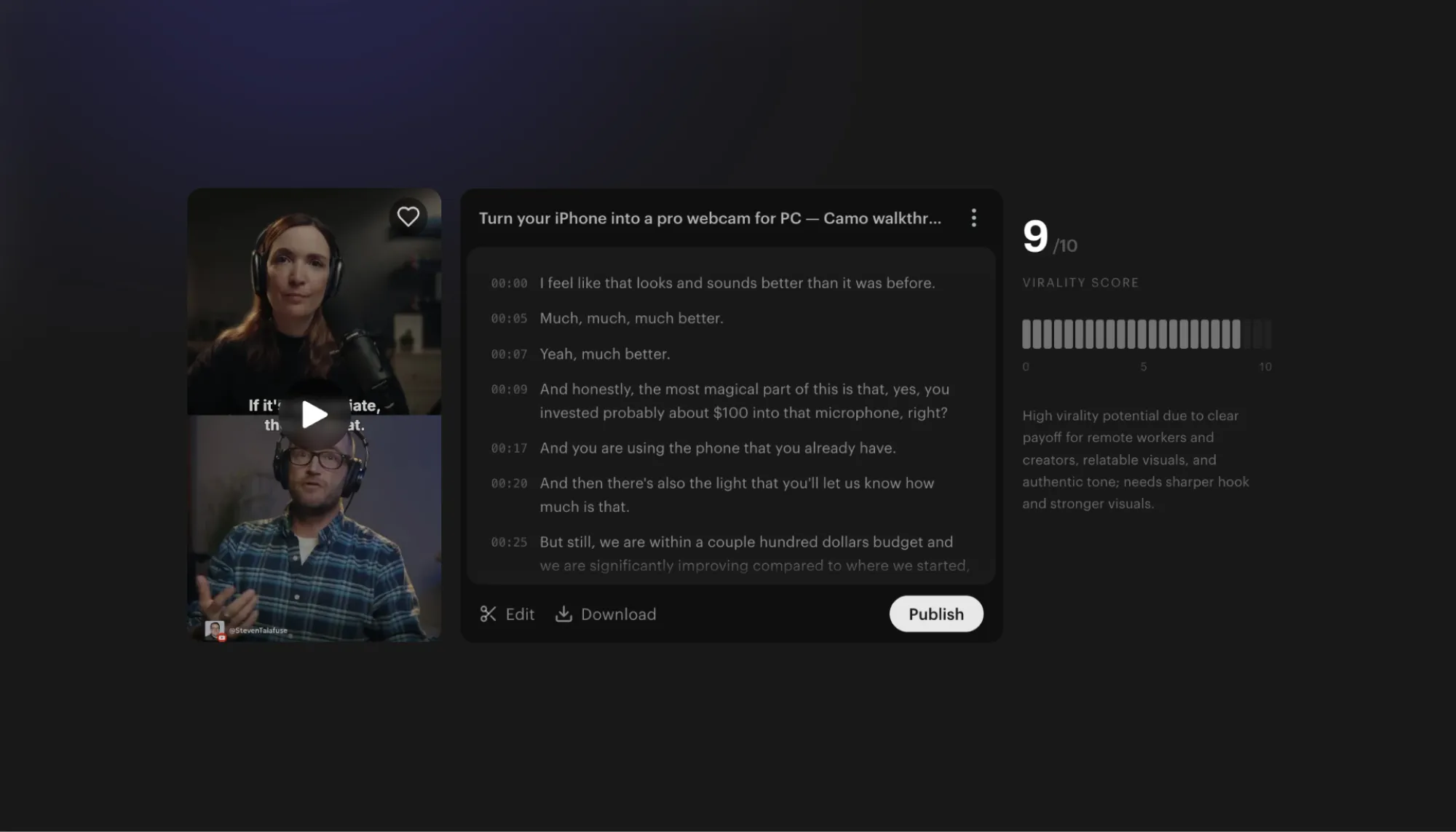 We’ve refreshed the Clips interface with a cleaner design, smoother animations, and polished visual details across your projects and folders. Every clip comes with virality descriptions, timestamped transcripts, and a clear view of which channels each clip has been posted to.