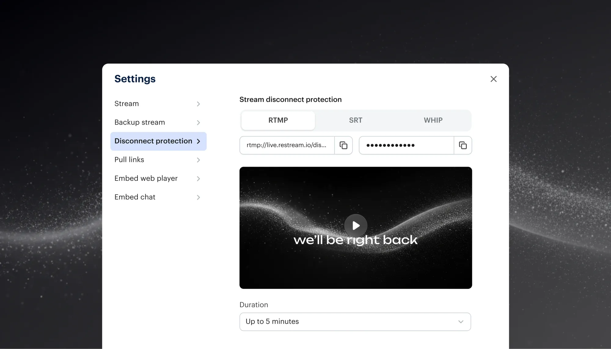 Streaming via RTMP, SRT, or WHIP? Our video protection automatically plays if your stream drops, keeping your event live and your audience engaged until you’re back.